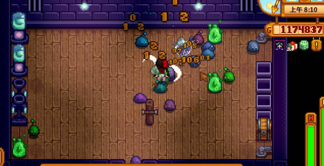 接着我们最好挑一个好运天,如果没有碰上好运天的话,可以用一些增加运气的东西,比佩戴幸运戒指,也可以吃一些增加幸运的食物,比如说幸运午餐还有南瓜汤。刷五彩史莱姆就是直接用楼梯搭梯子往下找, 找到怪物层之后记住层数,因为同一天的怪物层,对应的层数都是不变的然后我们就每次都坐到最近的电梯,然后搭梯子反复进入怪物层去刷就可以了。运气好的情况下,基本上刷上好几次就可以出来,运气不好的话需要刷几天。