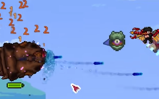 这些深渊鱼怪的外形与食人鱼比较相似,会主动朝着目标高速游过去并在贴近之后发动高伤害的撕咬攻击。同时遗忘之主还出在射出具有散射性的漩涡状弹幕时,间断性喷涌出可以被实心物块弹开的小水波。继续将其剩余的血条打至不到百分之三十八时,遗忘之主就会主动将外面的壳给脱掉并进入到最终的战斗形态。这里需要在脱离外壳束缚后的遗忘之主,其在水下的基础位移移速会在上一个形态的基础上增长一大截。并且对方还会新增加一种带有索敌效果的远攻手段,此时可以看到boss本体周身汇聚着一道小型的漩涡,随后怪物就会朝着角色发射出自带强索敌效果的追身涡轮。