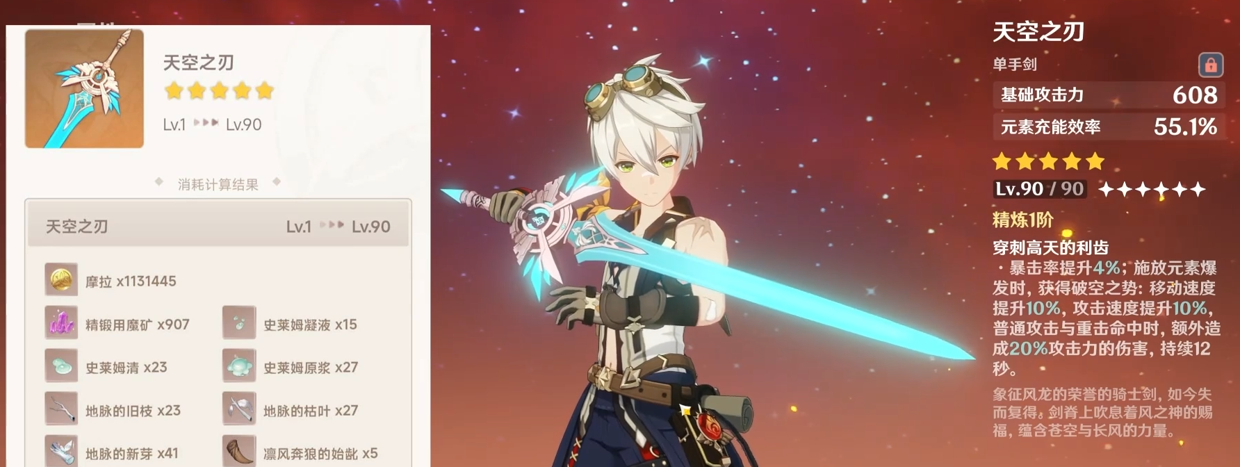武器上推荐用天空之刃和风鹰剑,优先天空之刃,它本身除了极高的攻击力外还有个副词条是元素充能效率,提高了释放技能的效率,充能本身就达到250%以上则选择风鹰剑,它的基础攻击力更高,带来更高的加成。没有这两个五星武器就次选西风剑、原木刀或飞天御剑,它们的攻击力都有点低但在同档次中还算入流,主要是拿它们的元素充能来补技能,所以无需在意。不需要做像祭礼剑这种做短E技能的武器特效,本身班尼特的E冷却就短,更何况玩的是工具人流。