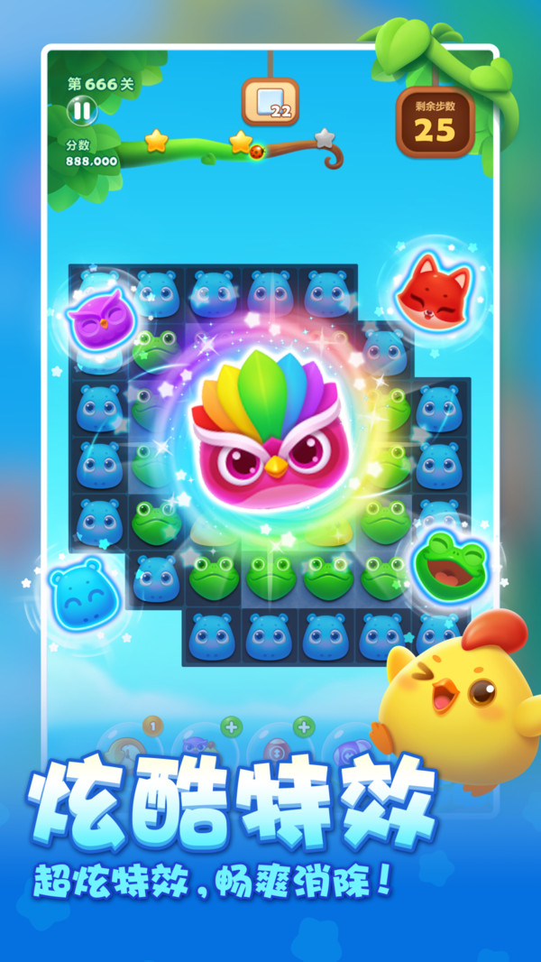 2、包含特色特效元素:4个相同元素生成直线消除道具、5个元素生成范围爆破道具、特效组合使用可触发更强效果。